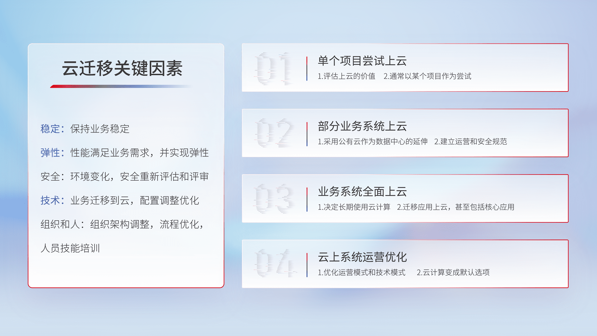 结合实际业务,,,从规划设计、、、、云平台选型、、、、云原生改造、、数据迁移、、集成交付,,迁移全过程为客户识别最佳上云路径,,,,做好风险识别管理,,,,设计网络架构、、、、身份权限、、、、安全审计合规、、操作审计、、、日志审计、、监控告警策略、、、、多站点容灾设计等,,对云上基础设施进行整体规划,,提升IT治理水平,,以满足弹性、、、、高可用、、、、高性能的需求。。