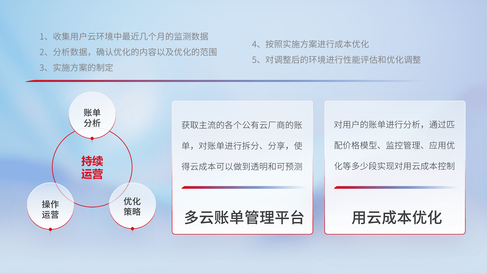 通过多云纳管,,,以统一的资源数据模型把客户的云资源进行抽象和封装,,,进而实现对多云资源的统一操作,,,,保障云资源管理的可靠性、、稳定性与可用性。。。量身定制化运维内容,,,配置、、、、开发运维、、补丁管理、、备份、、、监控、、、、认证和访问管理、、、审计和日常巡检等,,,保障在用云过程中的可靠度,,,稳定度以及高可用率。。。。