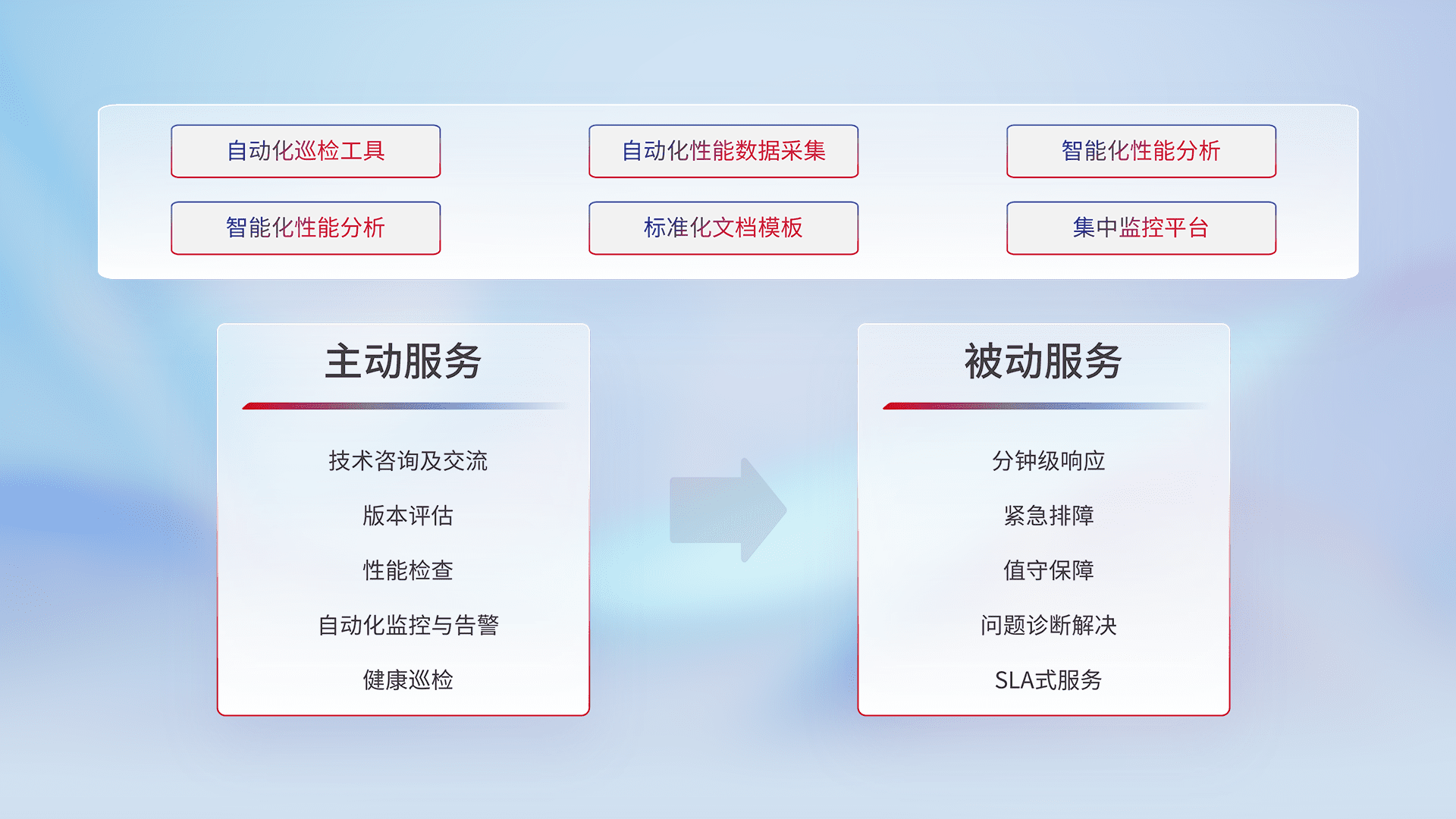 智能化工具和标准化文档,,,保障服务质量,,,提供主动服务(包含技术咨询、、版本评估、、、、性能检查、、、、自动化监控与告警、、健康巡检)和被动服务包含(分钟级响应、、紧急排障、、、值守保障、、、、问题诊断解决、、、、SLA服务)。。